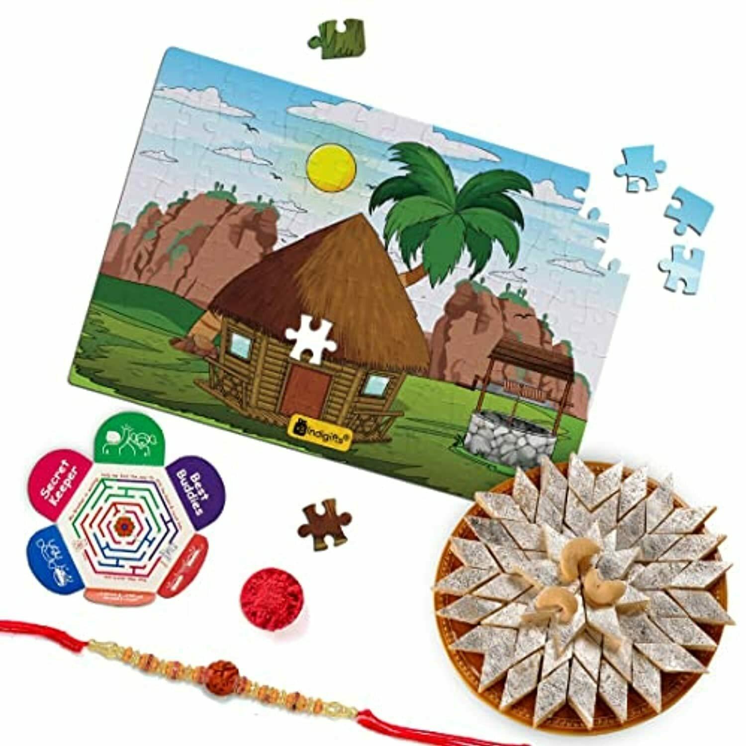 Indigifts Crossword Puzzle, Kaju Katli, Roli with Card and Rakhi Gifts Combo Set Rakshabandhan Enjoyable